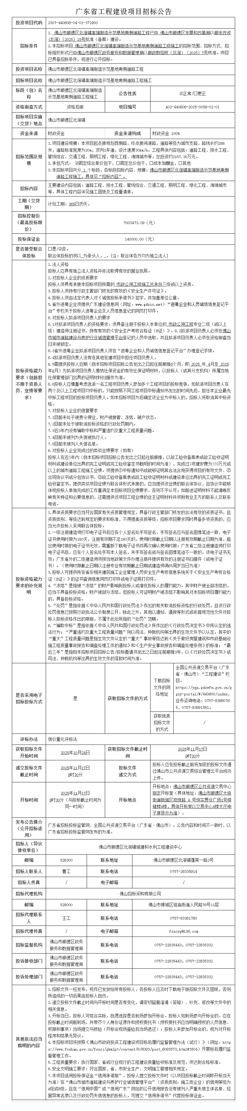 > 佛山市顺德区北滘镇高端制造示范基地南侧道路工程施工招标公告
