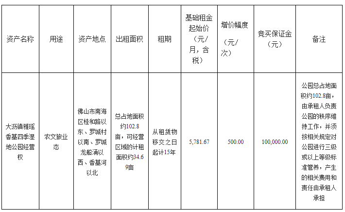 南海大沥镇雅瑶香基四季湿地公园经营权出租项目