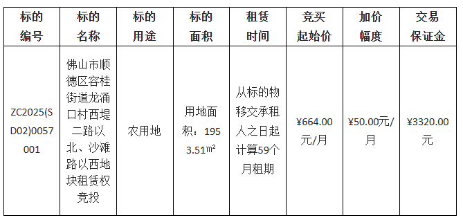 出租方采用网上竞价方式出租位于佛山市顺德区容桂街道龙涌口村西堤二路以北、沙滩路以西地块租赁权竞投,欢迎符合资格的竞买人参与竞价。