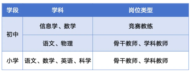 - 需持有应聘学科的竞赛教练证,区级以上在聘名师,教学管理能力强,有竞赛教练经历,且所带学生获省赛一等奖及以上奖项,能独立完成本学科竞赛教学工作。