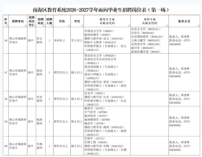 1.南海区教育系统2026-2027学年面向毕业生招聘教师计划及岗位表(第一场)