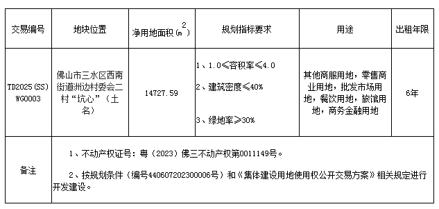 五、有意参与竞租者可于2025年11月4日后登录网上交易系统下载TD2025(SS)WG0003地块的《佛山市三水区农村集体经营性建设用地使用权网上挂牌出租文件》。
