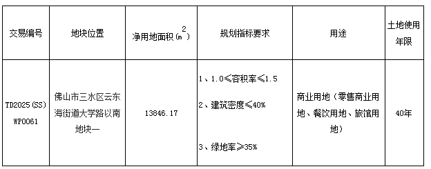 五、有意参与竞买者可于2025年11月7日后登录网上交易系统下载TD2025(SS)WP0061地块的《佛山市三水区国有建设用地使用权网上拍卖出让文件》。