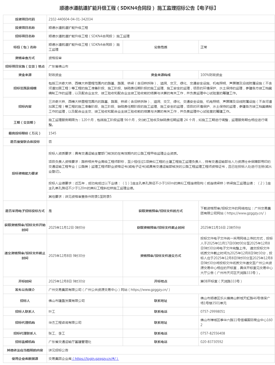 顺德水道航道扩能升级工程_顺德水道航道扩能升级工程(SDKN4合同段) 施工监理招标公告