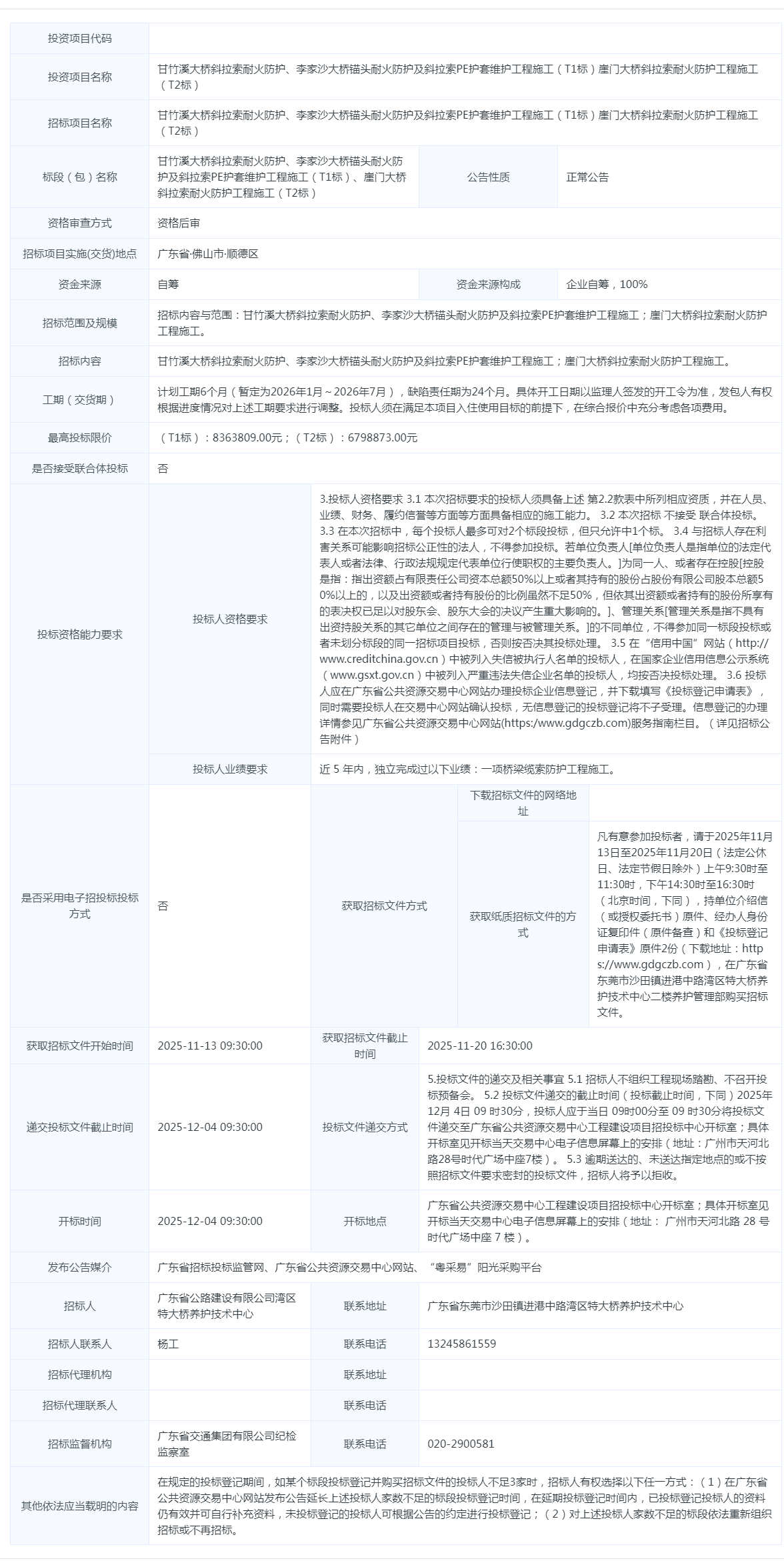 概述:招标内容与范围:甘竹溪大桥斜拉索耐火防护、李家沙大桥锚头耐火防护及斜拉索PE护套维护工程施工;崖门大桥斜拉索耐火防护工程施工。......
