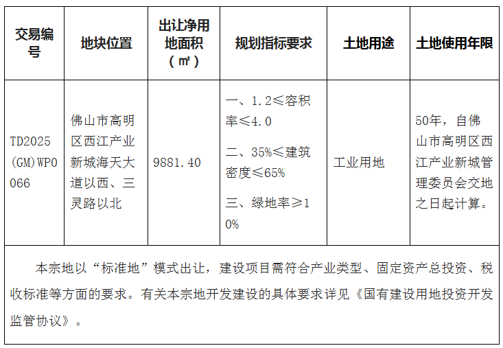 本块地其他规划建设要求按《高明区土地使用规划条件》(佛规明设函〔2025〕0114号)执行。