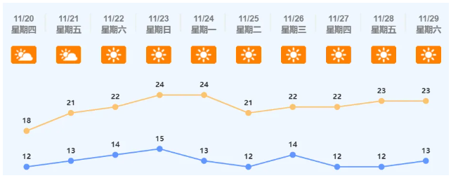 概述:11月21日,多云到晴,气温13℃~21℃;11月22日至23日,晴朗干燥,气温分别逐日升至14℃~22℃、15℃~24℃;......