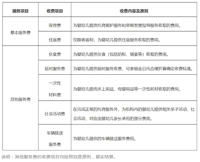 在收费管理方面,《通知》明确普惠托育服务机构收费包括基本服务费和其他服务费。其中,基本服务费包括保育费、住宿费(仅限寄宿制);其他服务费指在基本服务费外,服务机构收取或代收的伙食费、材料费等其他费用。