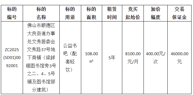 佛山市顺德区景良投资发展有限公司采用网上竞价方式出租位于大良街道办事处文秀居委会文秀路37号地下商铺(梁銶琚图书馆旁3号之二、4、5号铺及图书馆部分建筑),欢迎符合资格的竞买人参与竞价。