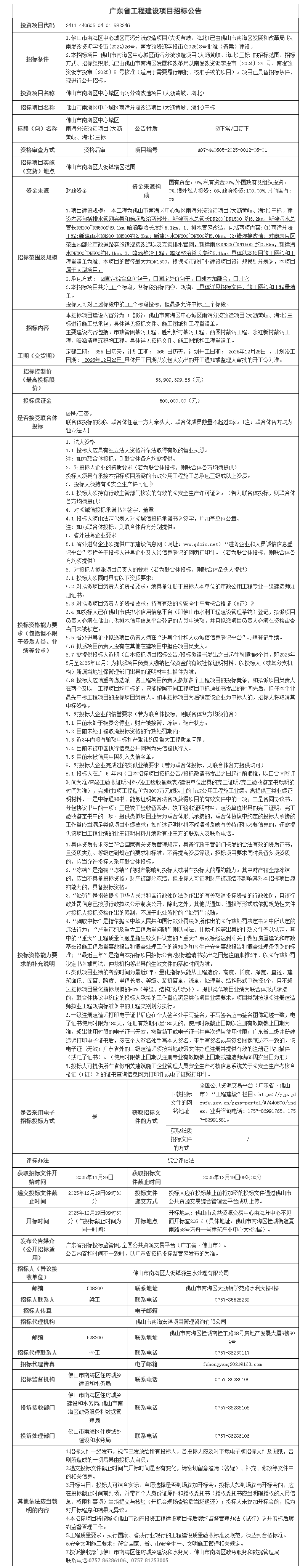 佛山市南海区中心城区雨污分流改造项目(大沥黄岐、海北)三标招标公告