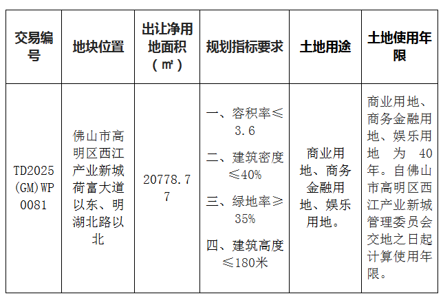 概述:经佛山市人民政府批准,受佛山市自然资源局(以下称委托人)委托,本中心(以下称拍卖人)现采用网上拍卖方式出让以下地块的国有建设用地使用权......
