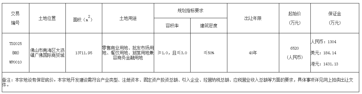 九、自本次公告起至网上挂牌截止期间,如有关于本宗地网上挂牌文件的修改、澄清、说明等将通过广东省公共资源交易平台和佛山市国有建设用地使用权和矿业权网上交易系统进行发布,有意参与竞租者请密切留意。其它未尽事宜,详见该地块的交易文件。