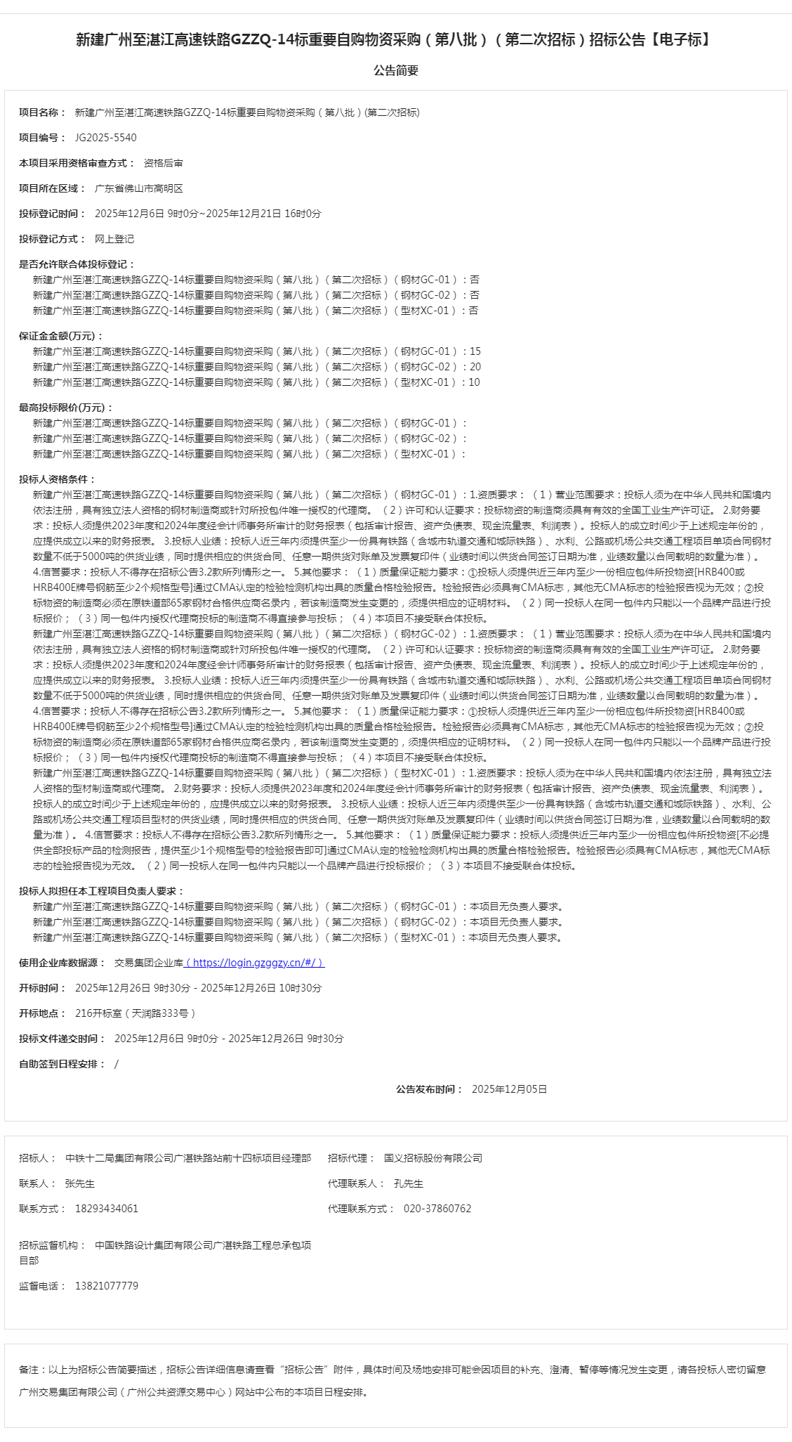 项目名称:新建广州至湛江高速铁路GZZQ-14标重要自购物资采购(第八批)(第二次招标);项目编号:JG2025-5540;本项目采用资格审查方式:资格后审...[阅读全文]