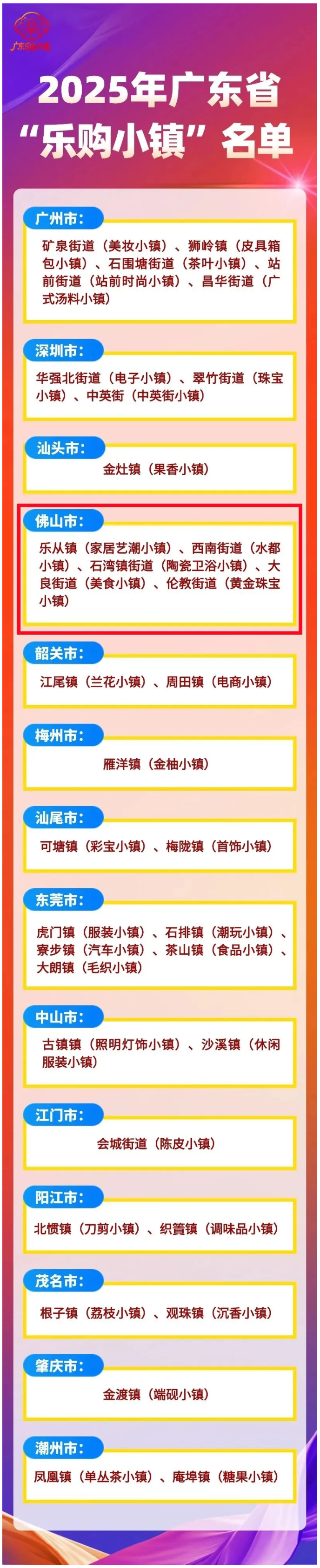 近日,广东省商务厅发布2025年广东省“乐购小镇”名单,共有34个镇(街)入选,当中包括佛山市的乐从镇、西南街道、石湾镇街道、大良街道和伦教街道5个镇街。值得关注的是,佛山入选数量与广州市、东莞市持平,列居全省第一梯队。