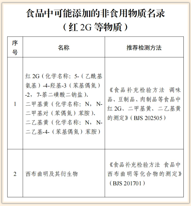 近日,市场监管总局、国家卫生健康委联合发布《关于将红2G等物质纳入食品中可能添加的非食用物质名录的公告》,将红2G、二甲基黄、二乙基黄、西布曲明及其衍生物纳入非食用物质名录。其中,红2G、二甲基黄、二乙基黄为工业染料,可能会被不法商家用于腊肠等食品染色以改善色泽,具有一定健康风险;西布曲明具有神经抑制作用从而达到抑制食欲、减重的效果,但可能引发心律失常等不良反应。名录中同时按规定发布了配套检验方法。