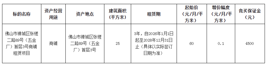 2.佛山市公共资源交易中心南海分中心通过佛山市资产交易网上交易系统及粤公平网站发布的项目信息(包括但不限于公告信息、交易文件、合同条款等)并不构成佛山市公共资源交易中心南海分中心对项目的任何交易建议。意向竞买人应不依赖于已披露的项目信息并自行对项目的相关情况进行必要的尽职调查和充分了解,对是否竞买该项目及项目成交后可能发生的费用和存在的风险自行作出充分评估,并独立承担所有风险。意向竞买人一经申请参加竞买,即视为知晓、认可项目现状,佛山市公共资源交易中心南海分中心对此不承担任何法律责任。