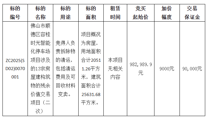 佛山市顺德区容桂时光智能化停车场项目涉及的13宗房屋建构筑物的残余价值交易项目(二次)
