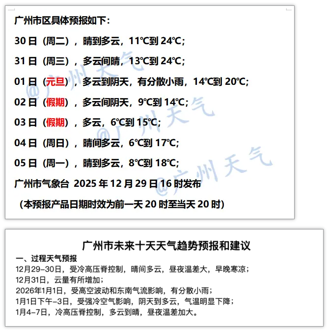1月2-3日,受冷空气继续影响,全省大部分市县阴天转多云到晴,各地气温陆续下降7~9℃。2日早晨粤北市县有5℃以下低温,局部有霜冻或冰冻,3日早晨中北部市县有5℃以下低温,高海拔山区0℃以下,部分市县有霜冻或冰冻。