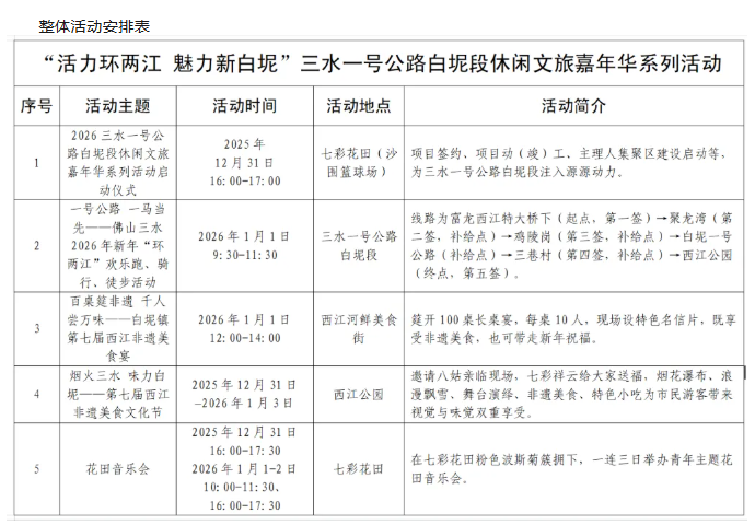 “活力环两江 魅力新白坭”三水一号公路白坭段休闲文旅嘉年华系列活动正在加紧筹办中,其中波子角片区暂不对外开放。为了提供更优质的服务和体验,活动更新如下: