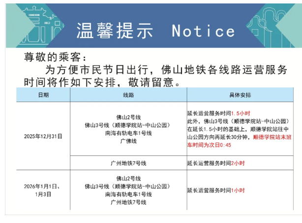 2026年元旦假期即将来临,为满足广大市民的出行需求,佛山地铁将对运营服务时间进行调整: