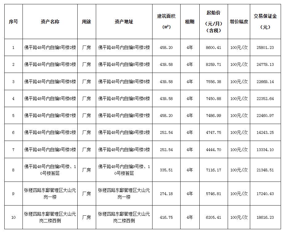 5.租金递增情况:序号1-8每满两年租金单价增加3元/m²/月;序号9-10每满两年递增3% 。