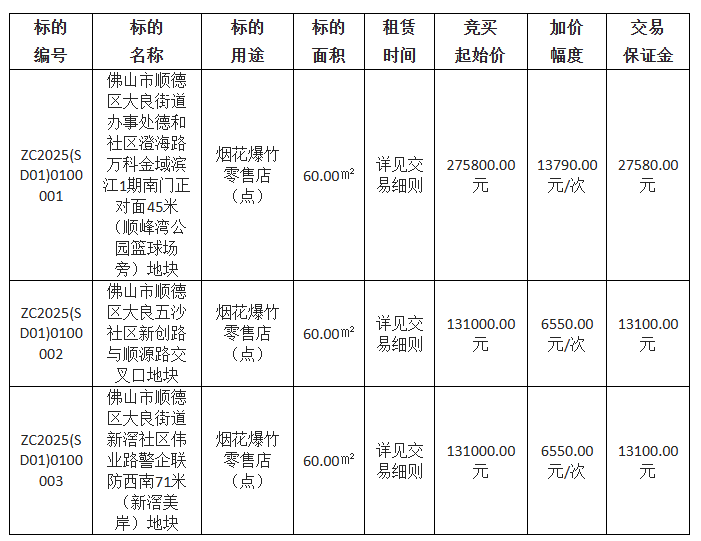 1.本项目佛山市顺德区大良街道办事处德和社区澄海路万科金域滨江1期南门正对面45米(顺峰湾公园篮球场旁)地块的交易保证金为人民币贰万柒仟伍佰捌拾元(小写:¥27580.00);佛山市顺德区大良五沙社区新创路与顺源路交叉口地块的交易保证金为人民币壹万叁仟壹佰元(小写:¥13100.00);佛山市顺德区大良街道新滘社区伟业路警企联防西南71米(新滘美岸)的交易保证金为人民币壹万叁仟壹佰元(小写:¥13100.00)