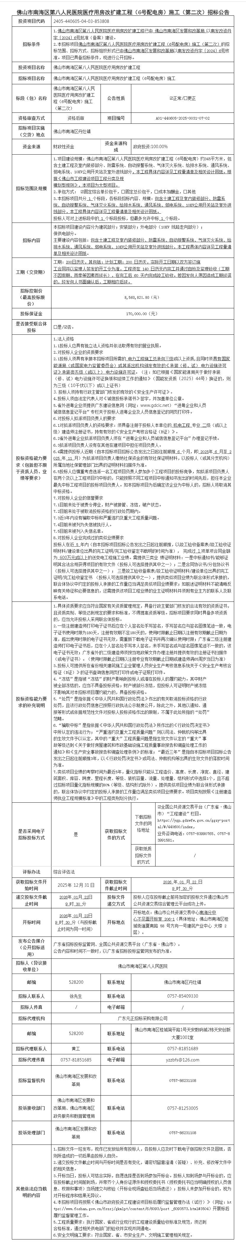 佛山市南海区第八人民医院医疗用房改扩建工程(6号配电房)施工招标公告