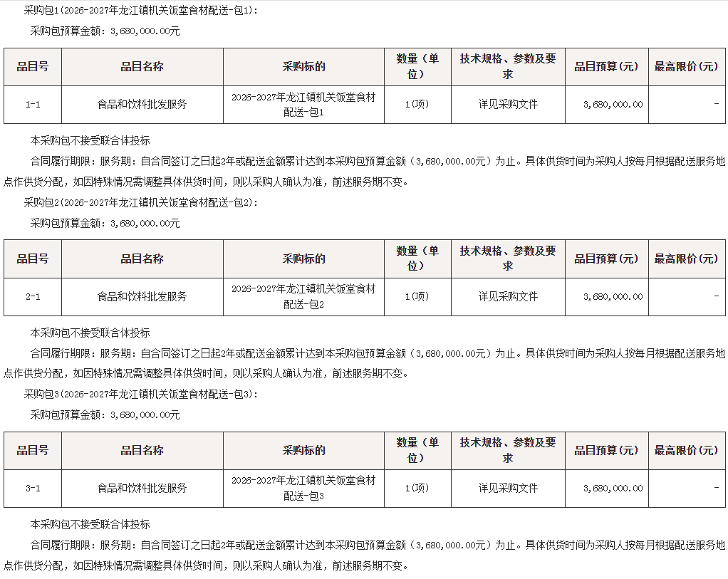 2026—2027年顺德龙江镇机关饭堂食材配送招标公告