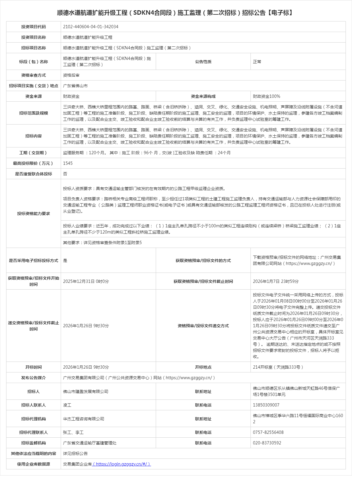 顺德水道航道扩能升级工程(SDKN4合同段)施工监理(第二次招标)招标公告
