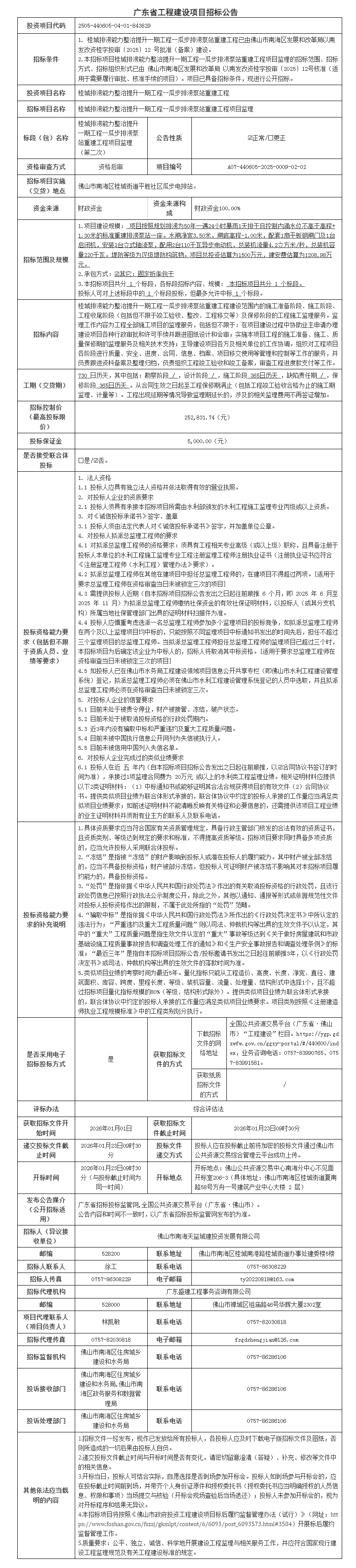 南海桂城排涝能力整治提升一期工程--瓜步排涝泵站重建工程项目监理招标公告