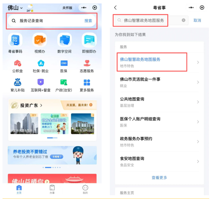 微信搜索“粤省事”小程序,或打开“粤省事”APP,选择办事城市“佛山”,在首页搜索栏输入“佛山智慧政务地图服务”,点击搜索结果即可进入地图首页查询。