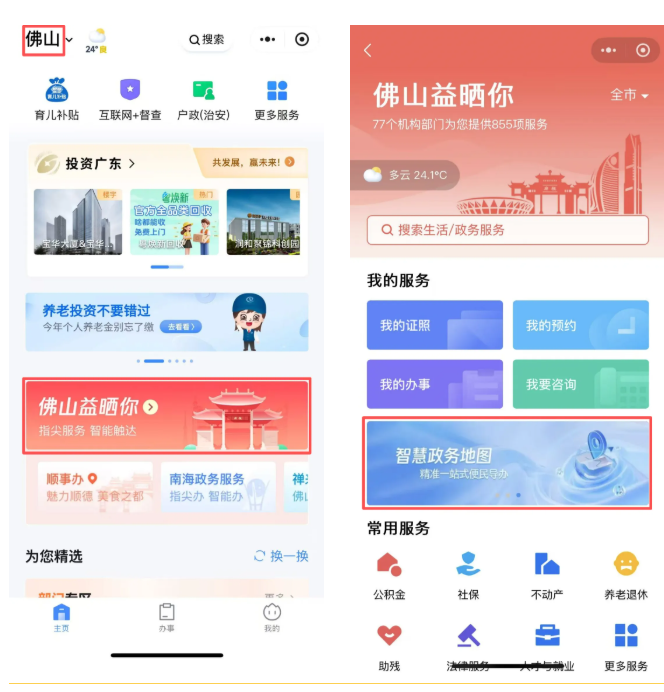 微信搜索“粤省事”小程序,或打开“粤省事”APP,选择办事城市“佛山”,进入“佛山益晒你”模块,点击“智慧政务地图”版面,即可进入地图首页查询。