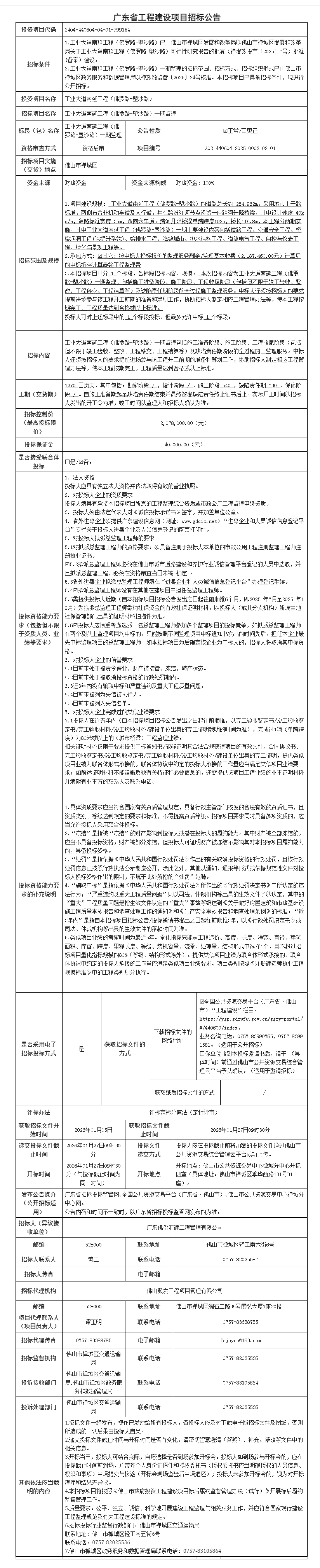 禅城区工业大道南延工程(佛罗路-塱沙路)一期监理招标公告