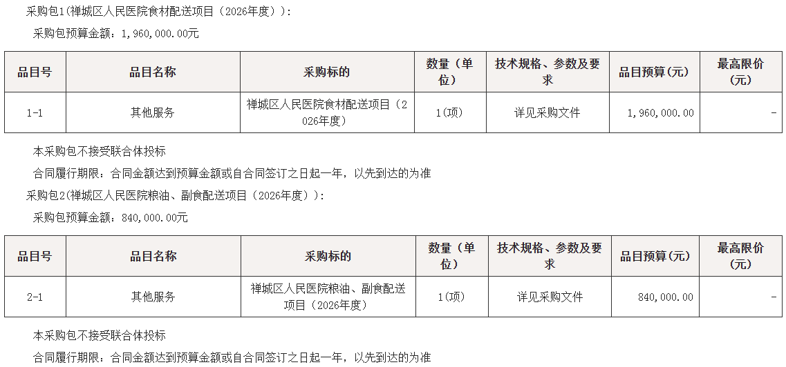 禅城区人民医院食材及粮油、副食配送项目(2026年度)采购项目的潜在供应商应在广东省政府采购网https://gdgpo.czt.gd.gov.cn/获取采购文件,并于 2026年01月21日 09时30分 (北京时间)前提交响应文件。