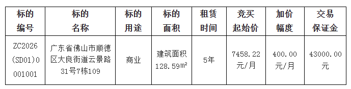 佛山市顺德区大良德良物业管理公司采用网上竞价方式出租位于佛山市顺德区大良街道云景路31号7栋109物业,欢迎符合资格的竞买人参与竞价。