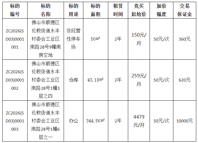 1.项目名称:佛山市顺德区伦教街道永丰村委会工业区南路28号9幢南侧空地等三宗物业公开招租项目