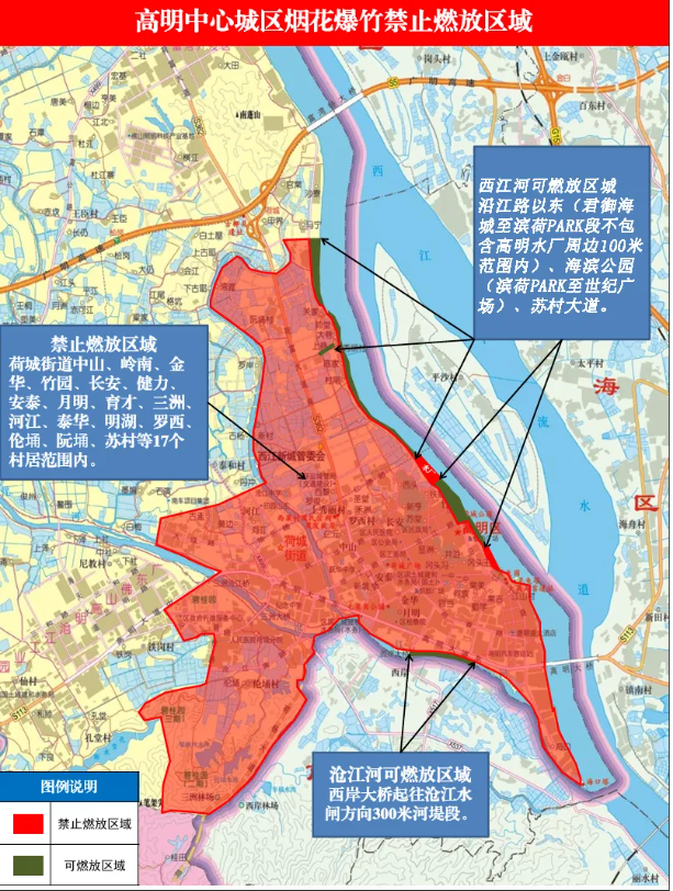 根据通告,位于高明中心城区的中山、岭南、金华、竹园、长安、健力、安泰、月明、育才、三洲、河江、泰华、明湖、罗西、伦埇、阮埇、苏村等17个村居,今年依旧被划入中心城区 禁燃区 ,除特设路段外,全年不允许燃放烟花爆竹。
