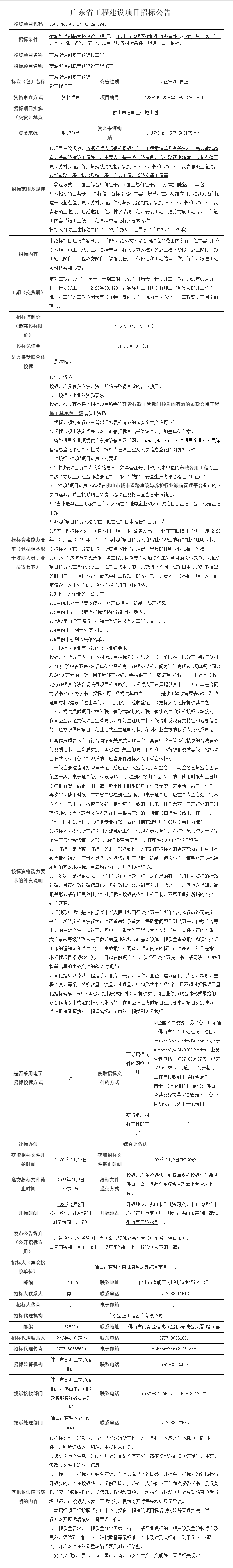 高明荷城街道创基南路建设工程施工招标公告