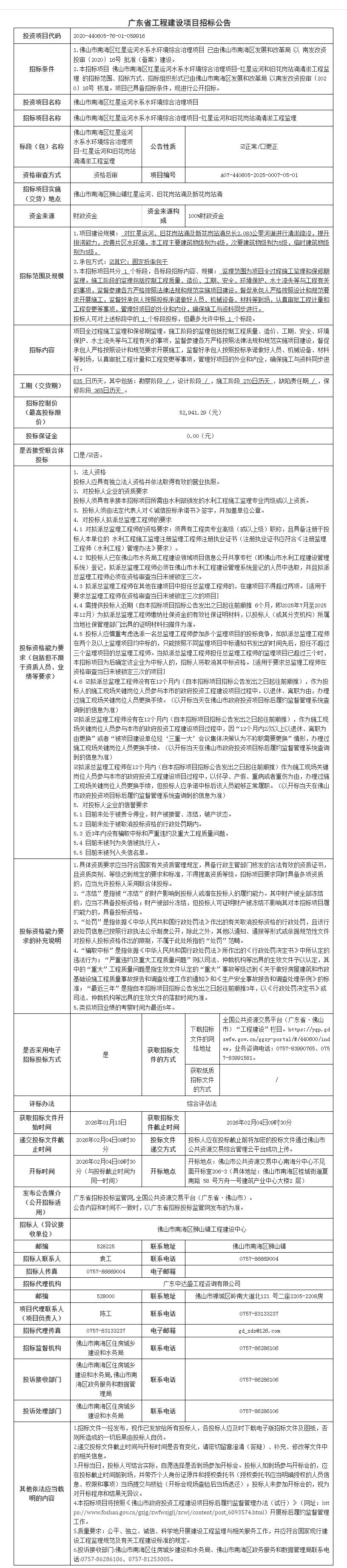 佛山市南海区红星运河水系水环境综合治理项目-红星运河和旧花岗站涌清淤工程监理招标公告