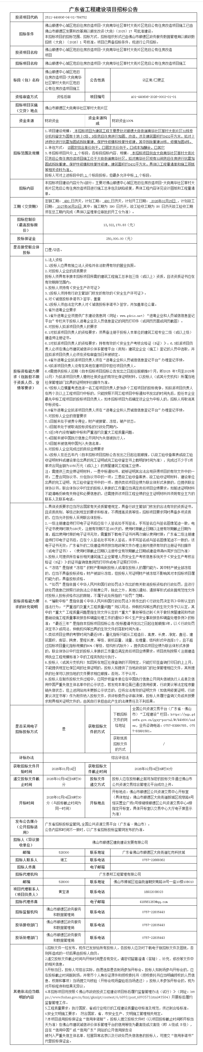 佛山顺德中心城区危旧住房改造项目-大良南华社区莘村大街片区危旧公有住房改造项目施工招标公告
