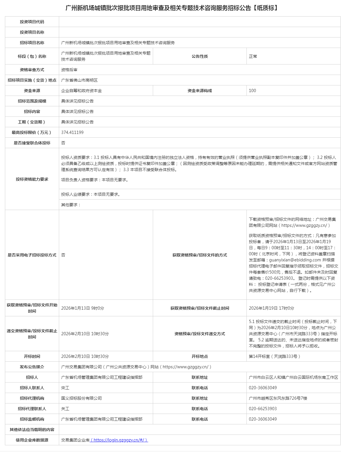 广州新机场城镇批次报批项目用地审查及相关专题技术咨询服务招标公告