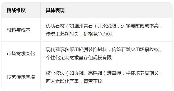 传承断层:传统石雕技艺复杂、周期长,年轻人从业意愿低,掌握核心技艺的老匠人数量稀少,目前缺乏明确的市级非遗代表性传承人体系,技艺传承多依赖家族或师徒小众延续。