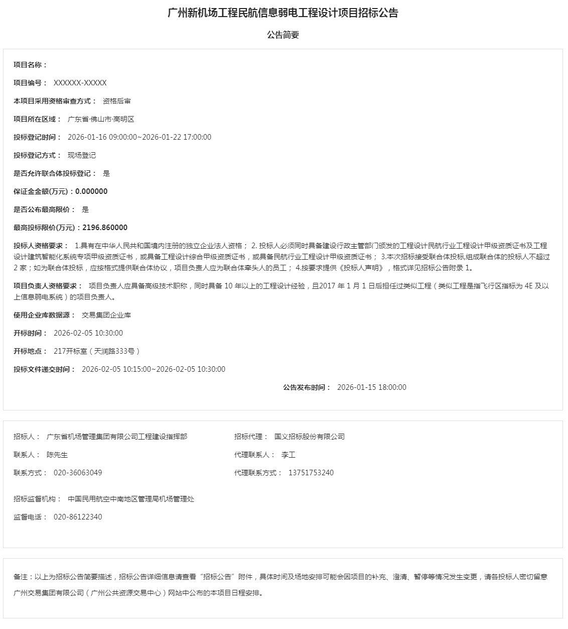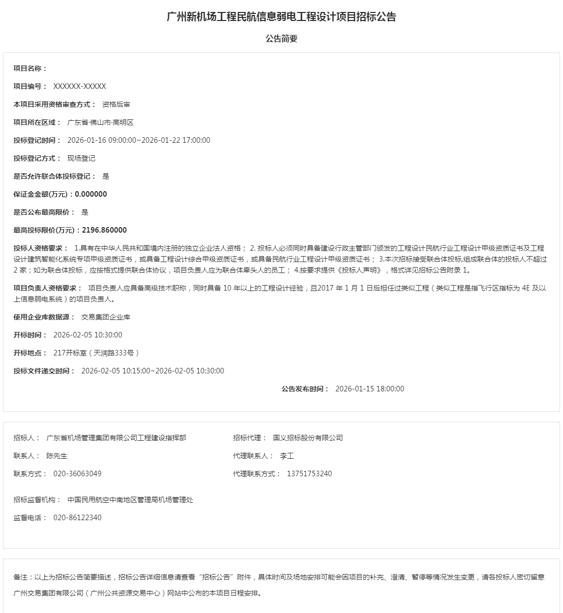 广州新机场工程民航信息弱电工程设计项目招标公告
