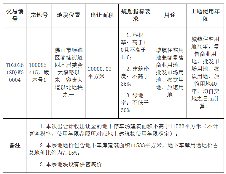 十一、自本次公告起至网上挂牌截止期间,如有关于本地块网上挂牌文件的修改、澄清、说明等将通过网上交易系统、佛山市顺德区公共资源交易中心网站发布,请有意参与竞买者密切留意。其它未尽事宜,详见该地块的交易文件。