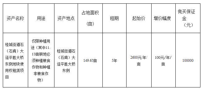5.标的物仅限种植用途(其中11.13亩耕地必须种植粮食作物和种植非粮食作物)。禁止用作违法经营及危险易燃易爆行业、废旧金属等回收行业,不得经营饮食行业,不得新建建(构)筑物。物业内不准住人。