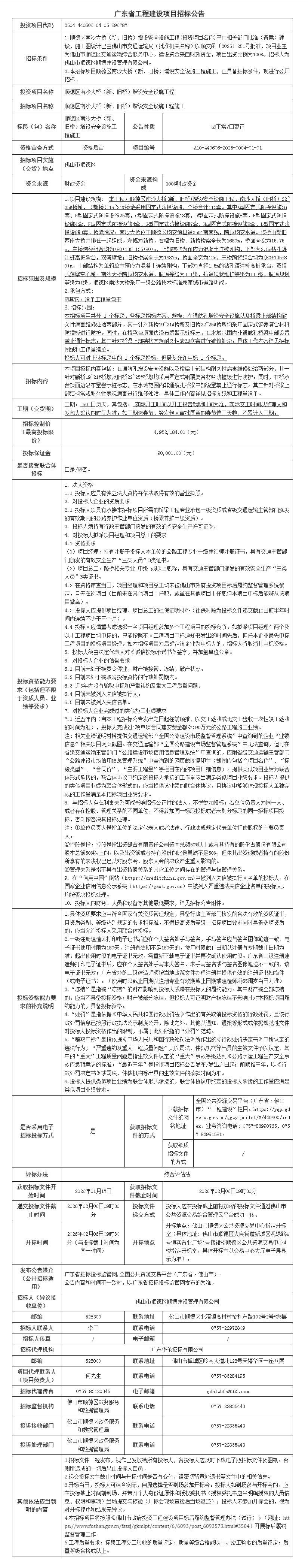 顺德区南沙大桥(新、旧桥)增设安全设施工程施工招标公告