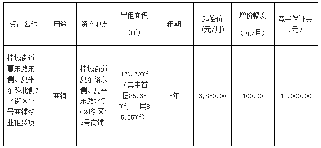 8.其他需要披露的事项:上述物业按现状招租。表内面积数据仅供参考,以实际交付出租面积为准,不影响租赁费用标准;该物业不适用于危险化学品的存储及高污染行业进驻;严格按照项目信息的物业用途使用,不得随意改变的物的用途。挺进街13号楼201房面积为35.4㎡,从2026年5月16日起开始移交和计租,物业移交后签订补充协议,租赁单价按主合同当期单价计算,租赁起始日期为2026年5月16日,租赁终止日期与主合同一致,该部分物业无免租期,2026年5月16日起总面积变更为724.55㎡。