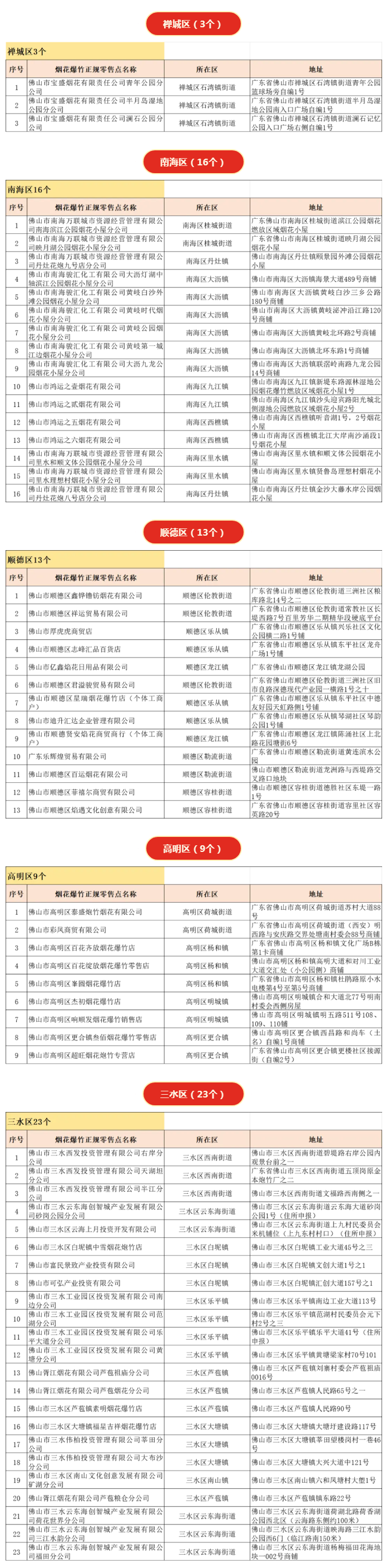 截至1月26日,全市五区共审批发证烟花爆竹正规合法零售点64个(其中禅城区3个、南海区16个、顺德区13个、高明区9个、三水区23个),另有部分零售点正在审批,日后“佛山应急管理”微信公众号将公布更新名单,敬请关注。