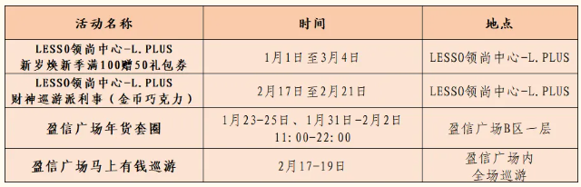 新春期间,LESSO领尚中心-L.PLUS和盈信广场两大商圈将推出一系列年货促销活动,消费满额即可参与,更有财神巡游派利是,收获新春好彩头。
