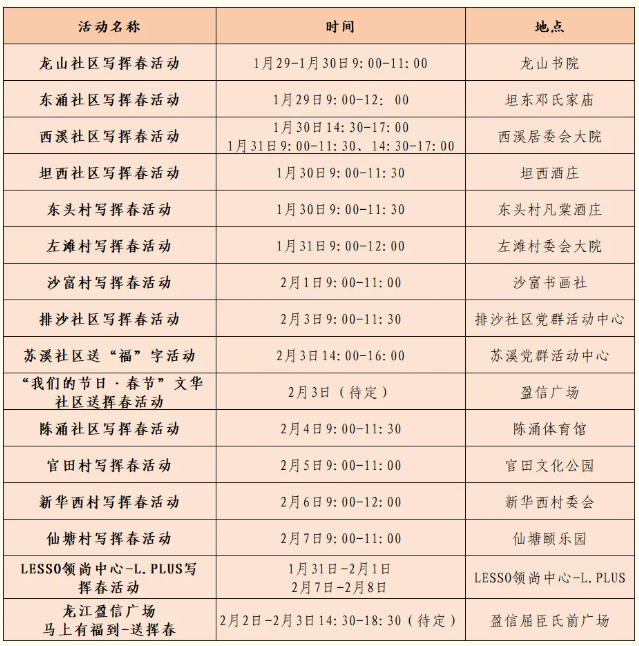 春节前夕,龙江镇14个村(社区)和两大商圈将分别邀请书法名家开展春联暖万家活动,为广大群众送上一个有文化品味、有墨香韵味、有丰富年味的春节。